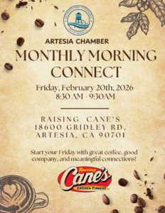 « All Events This event has passed. Monthly Morning Connect – Artesia Chamber February 20, 2026 @ 8:30 am - 9:30 am PST « Join us as we celebrate the Grand Opening & Ribbon Cutting of Curry On Pie! Add to calendar Google Calendar iCalendar Outlook 365 Outlook Live Venue Raising Cane’s 18600 Gridley Rd. Artesia, CA 90701 United States + Google Map